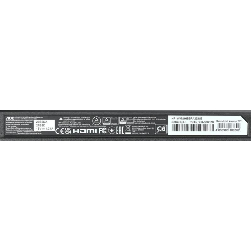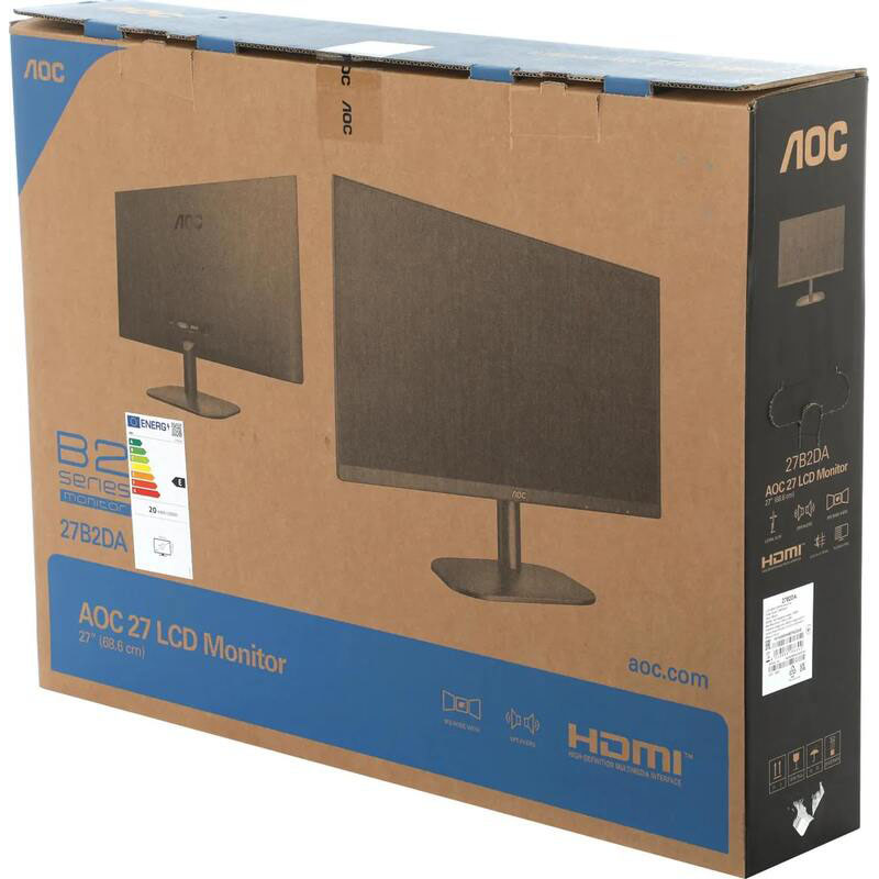 Монитор AOC 27B2DA с диагональю 27 дюймов и разрешением 1920x1080 пикселей воспроизводит видео в формате Full HD (1080p), радуя чёткими деталями и яркими цветами. Соотношение сторон 16:9 подходит для комфортной работы.