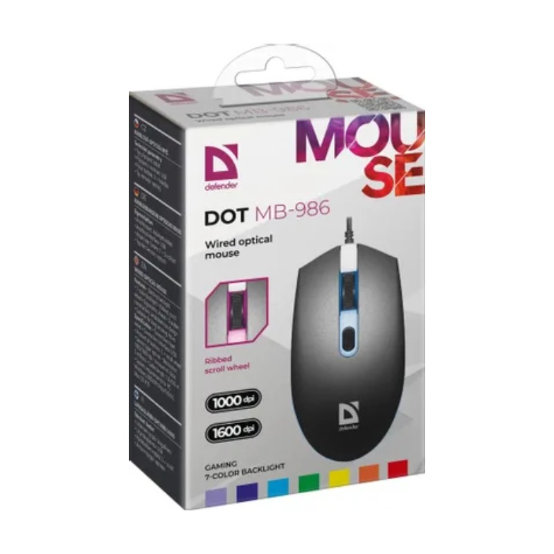Мышь проводная Defender Dot MB-986 выполнена в классическом чёрном цвете с разноцветной подсветкой, которая придаёт устройству современный вид. Лёгкий и эргономичный корпус подстраивается под руку пользователя, подходит как для правшей, так и для левшей.