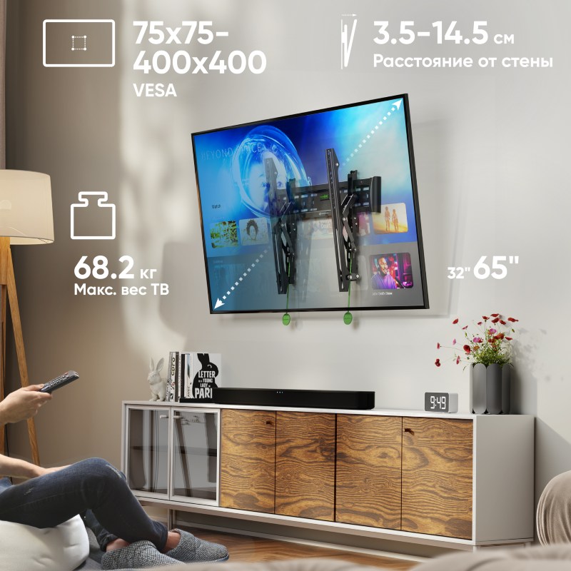 Сборка и установка настолько просты, что справится даже тот, кто впервые держит в руках отвёртку. Широкий диапазон совместимости VESA (до 400×400 мм) означает, что ваш телевизор 32-65 дюймов точно найдёт здесь свою идеальную опору.