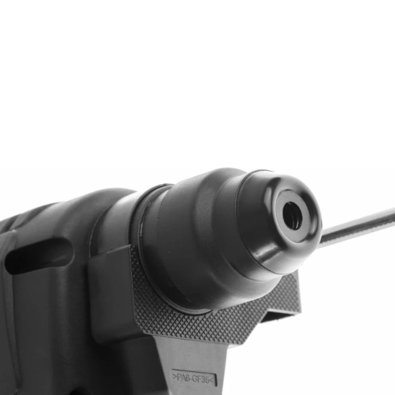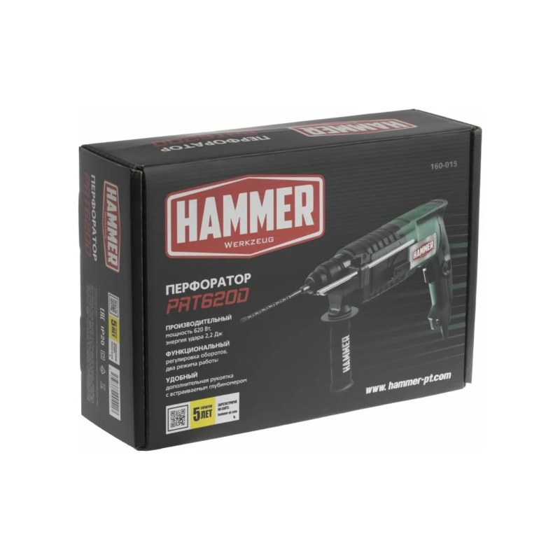 Hammer PRT620D оснащён рядом полезных функций, которые повышают удобство и безопасность работы. Предохранительная муфта защищает пользователя и инструмент от поломок при заклинивании бура. Ограничитель глубины сверления помогает контролировать глубину отверстий. Блокировка кнопки включения предотвращает случайный запуск инструмента. Длина кабеля — три метра обеспечивает свободу перемещения во время работы.
